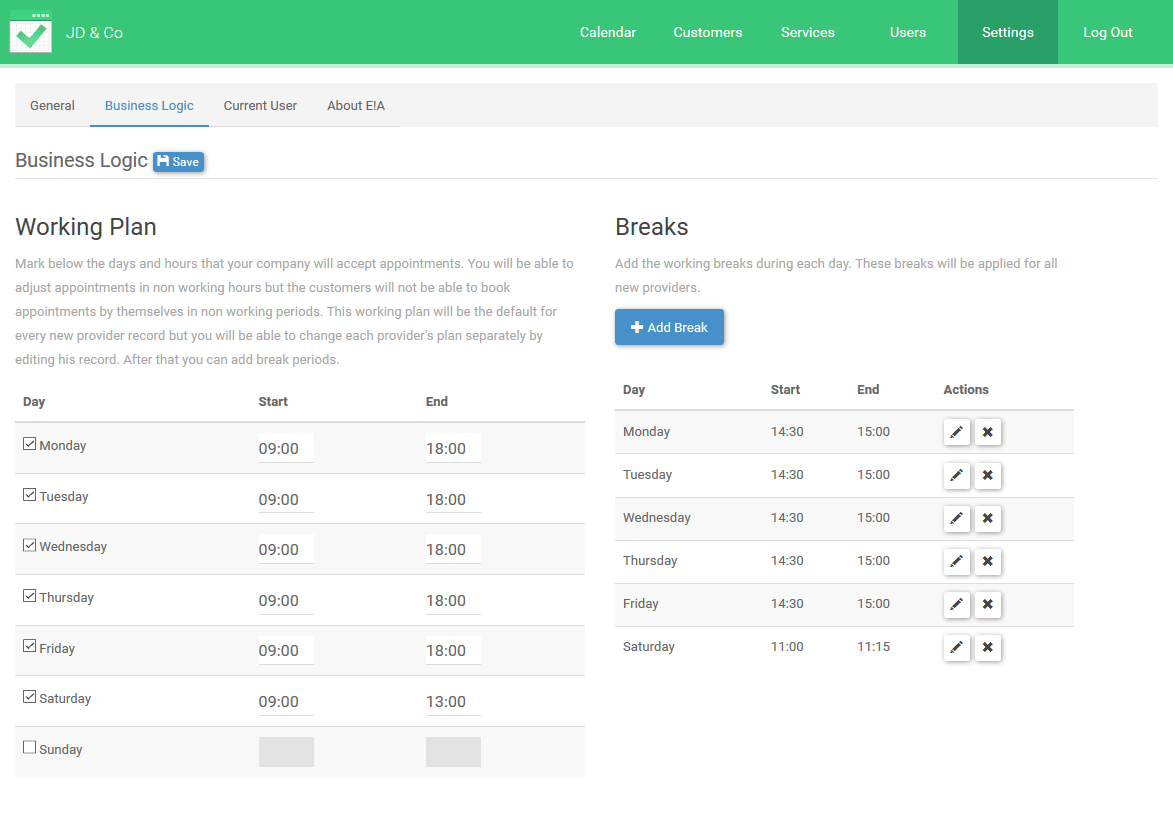Configure the system at your own will, apply the business hours and breaks and let customers book, modify or cancel appointments within specific time periods.