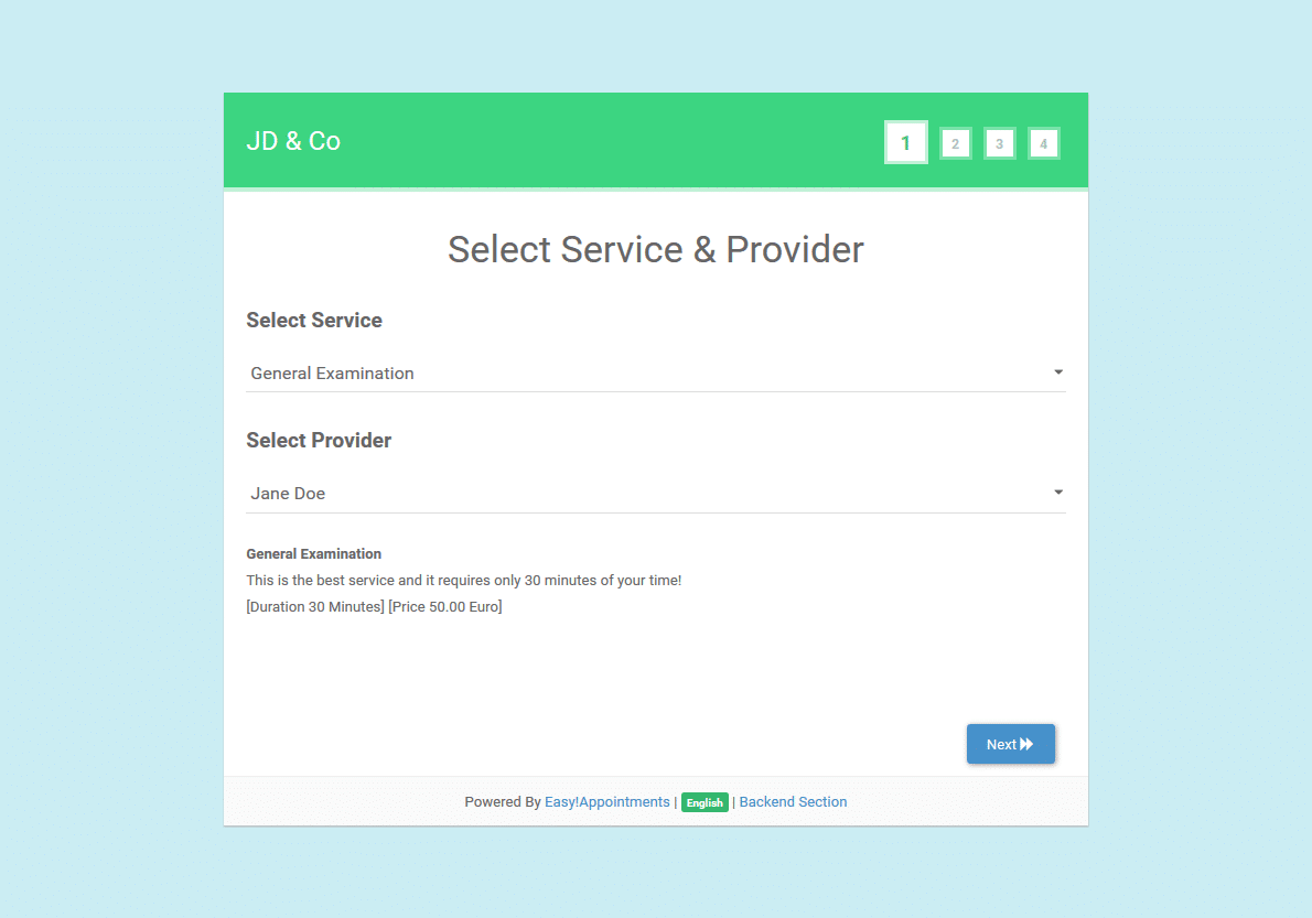 Set up your services and the employees/teams/sections which will serve the customers. Each service is completely configurable and every provider has his own schedule.